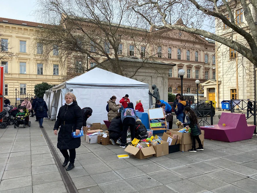 Ale věci se zde nezdrží dlouho. Krabice takřka čehokoli mizí řádově v minutách. Mnozí z těch, kdo sem donesou potřebné věci, odchází se slzami v očích. Všudypřítomné emoce podtrhuje zvláštní ticho procházejících ukrajinských žen a dětí, které se ocitly ze dne na den v cizím městě a neví, co s nimi bude, jak dlouho to potrvá a jestli to všechno vůbec někdy skončí. Proud těl nikde nezačíná, ani nekončí.
