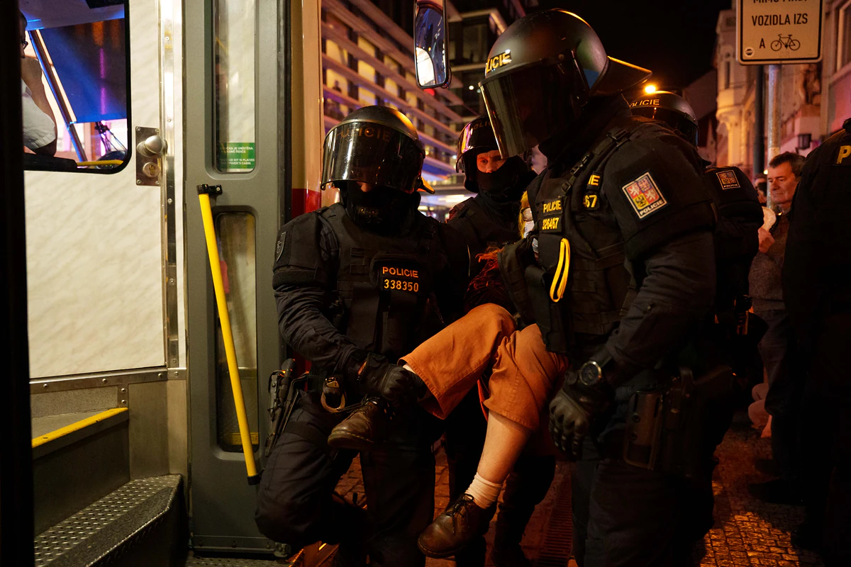Aktivní účastníci protestu byli jeden po druhém policií vyzývání k předložení dokladů a k opuštění blokády. Přestože někteří uposlechli, velká část z nich zůstala na svém místě. Těžkooděnci proto přistoupili k invazivnějšímu zásahu a začali aktivisty odnášet za ruce i nohy do poblíž zabržděné tramvaje č. 2. Ta mezitím přestala ukazovat konečnou zastávku Nádraží Braník a začala problikávat hlášení Mimořádná událost – provoz přerušen! Při pohledu na tramvaj T3, která se provizorně proměnila v zajišťovací centrum s pohozenými palestinskými vlajkami na zemi a vzkazy na oknech, to bylo poměrně výstižné popsání situace. Ačkoliv v tu chvíli již nikdo dopravu fyzicky neblokoval a policie nevpouštěla lidi do vozovky, demonstrace samovolně pokračovala dál provoláváním hesel k ukončení války.